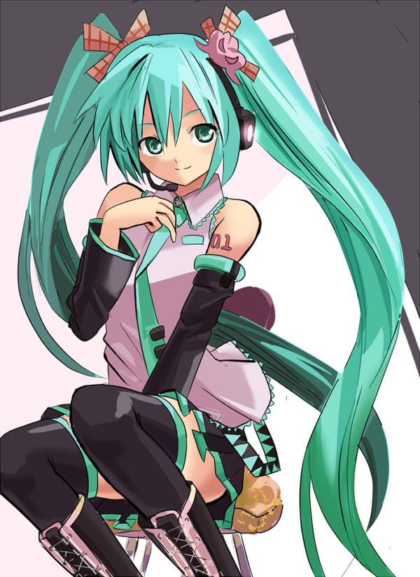 aqua eyesaqua hairbootschairdetached sleeveshair ribbonheadsetlong hairnecktieribbonsittingskirtsolothighhighstwintailsvery long hair