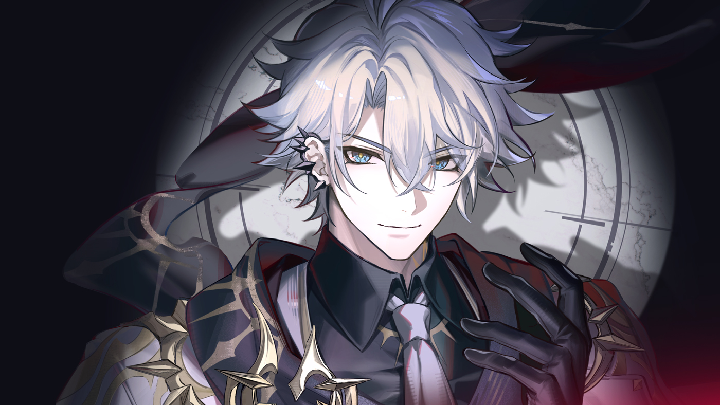 1boyarmorblack capeblack glovesblack shirtblue eyescapecollared shirtearclipglovesmale focusnecktieparted bangspauldronspurple necktieshirtshort hairshoulder armorside capesingle pauldronsolospotlightwhite hair