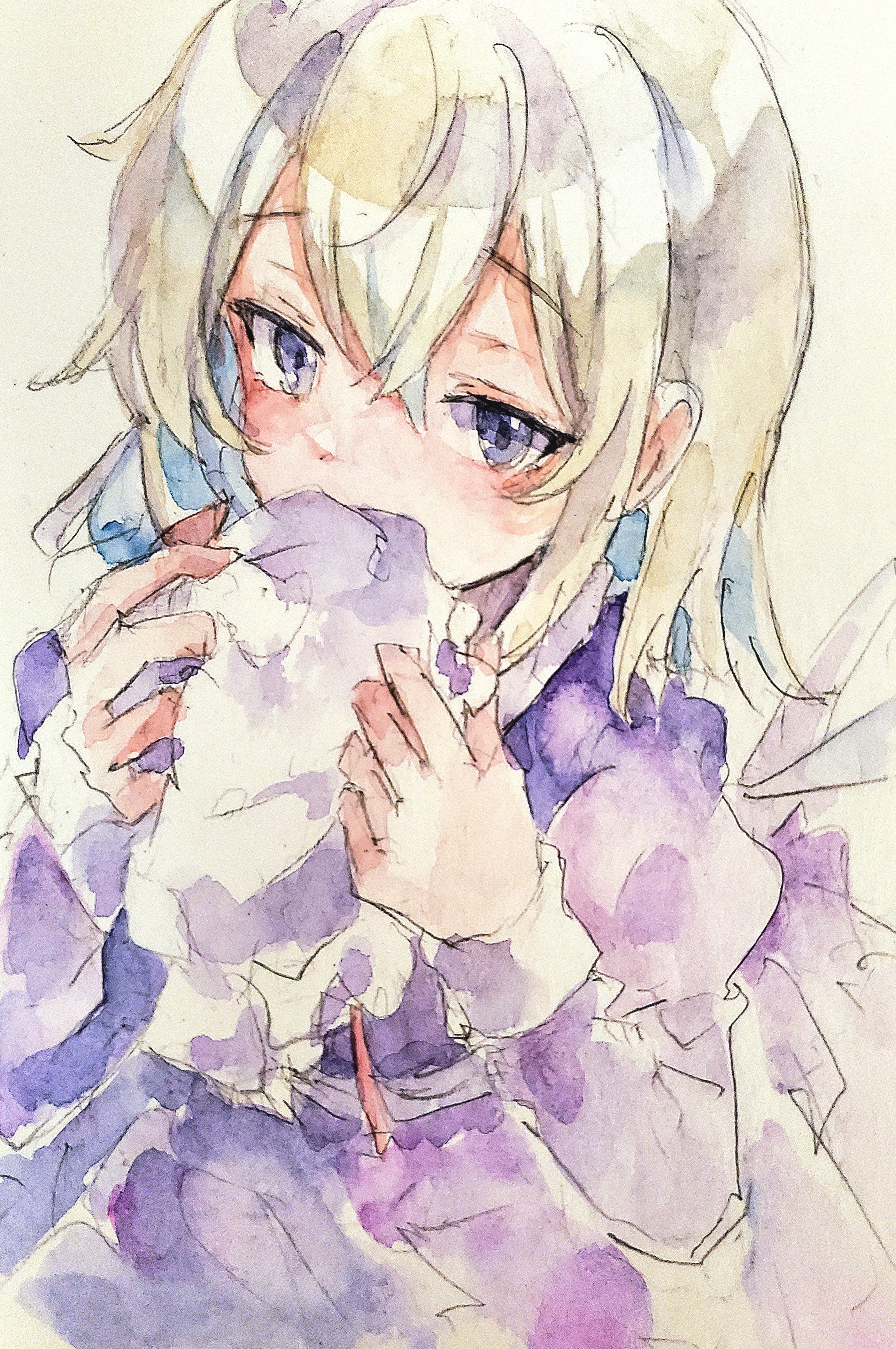 1girlblonde hairdresshair between eyeshatholdingholding unworn clothesholding unworn hatlong sleevesmedium hairmob cappurple dresspurple eyessolounworn hatunworn headwear