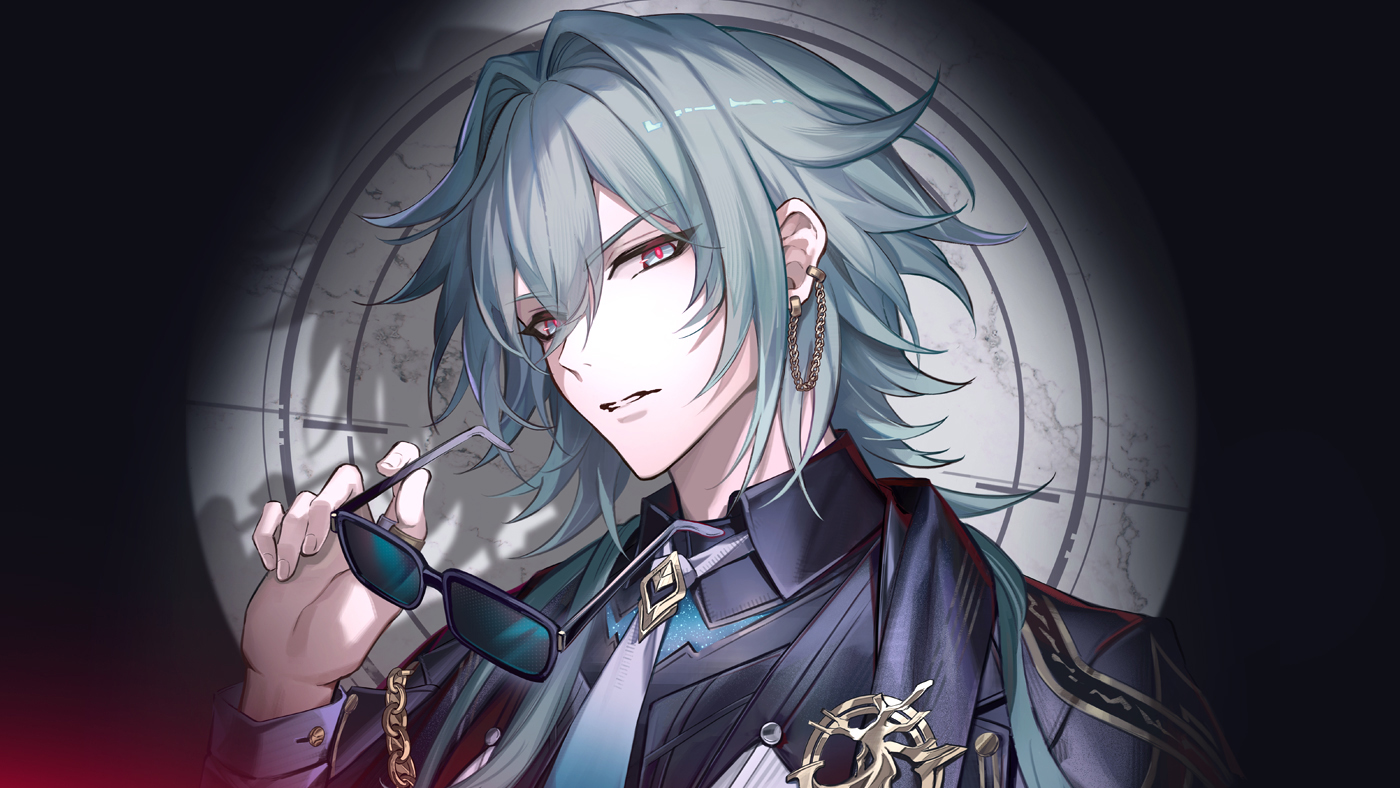 1boyaqua eyesaqua hairblack shirtcollared shirthair intakeshair over shoulderholdingholding removed eyewearlong hairlooking at viewerlow ponytailmale focusnecktieponytailpurple necktiered pupilsshirtsolospotlightunworn eyewear