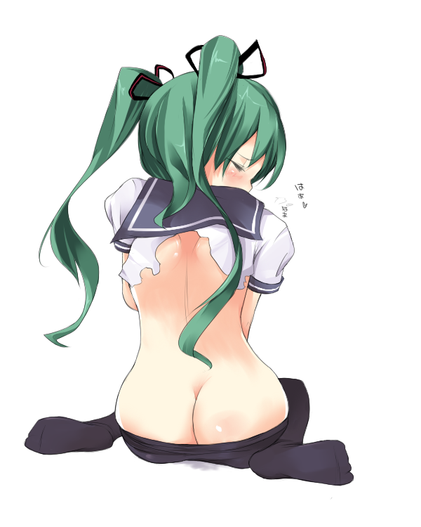 1girlassblushclosed eyesfemale focusfull bodygreen hairhair ribbonpantyhoseribbonschool uniformserafukusimple backgroundsittingsolotorn clothestwintailswhite background