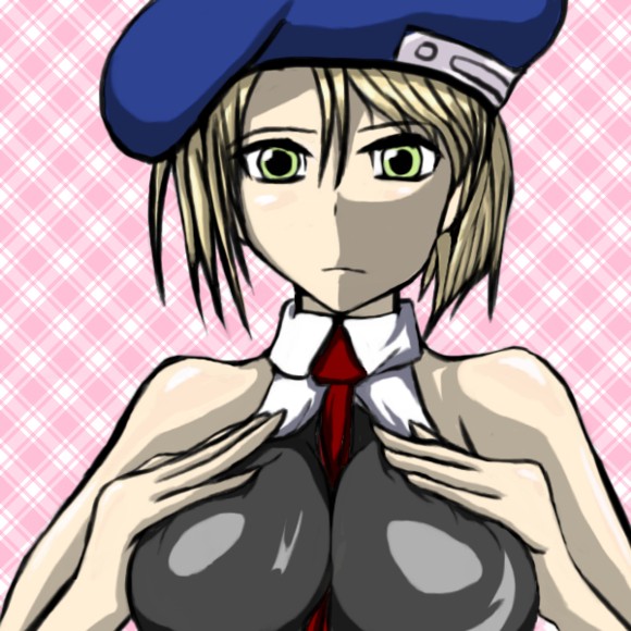 1girlberetblonde hairbreast suppressbreastsbreasts squeezed togetherfemale focusgreen eyeshatlarge breastsnecktieshort hairsolo