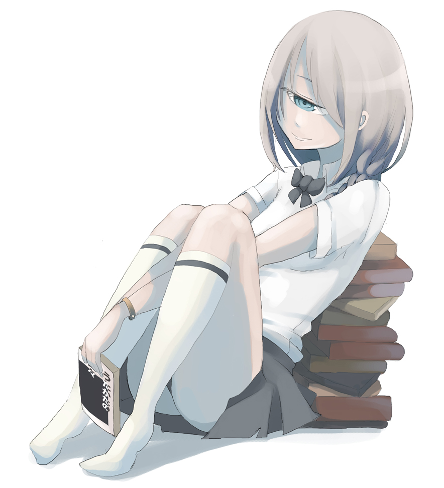 minamino kanata, tsuzaki aoba, jinki, duplicate, translated, 00s, 1girl, black hair, blush, female focus, knee up, kneehighs, leg lift, long hair, long sleeves, miniskirt, own hands clasped, own hands together, pencil skirt, purple eyes, school uniform, serafuku, skirt, socks, solo, very long hair