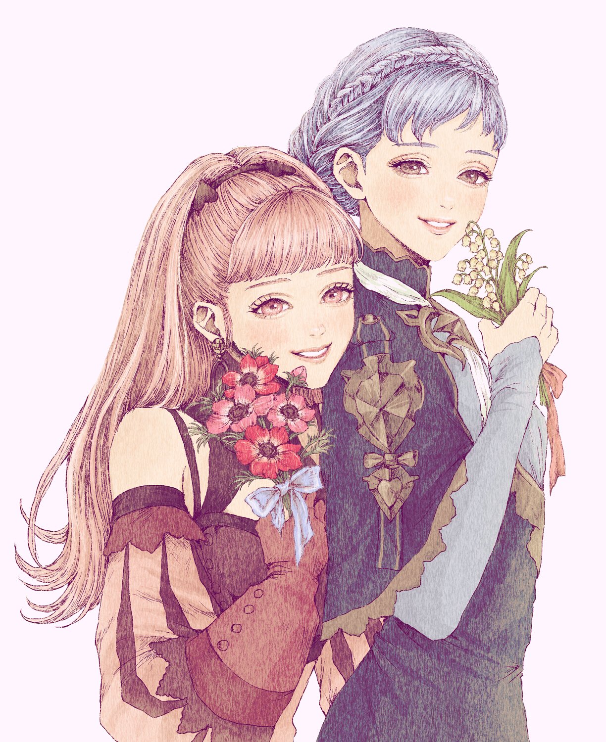 takepon, satou sei, toudou shimako, maria-sama ga miteru, light brown hair, 00s, 2girls, ascot, blonde hair, blue eyes, brown hair, looking at viewer, multiple girls, parted lips, projected inset, sailor collar, school uniform, simple background, smile, white background