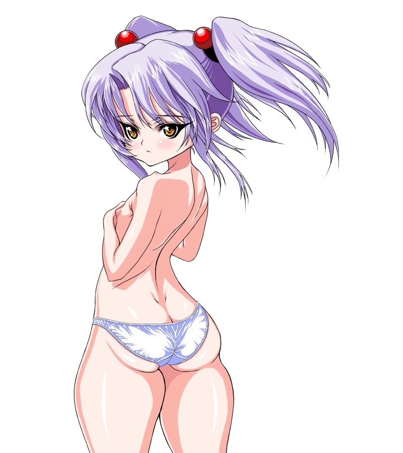 1girlassbackbad anatomyblushbottomlessfemale focusflat chesthair bobbleshair ornamentlooking backpantiespurple hairsolothick thighsthighstopless femaletwintailsunderwearunderwear onlywhite pantiesyellow eyes
