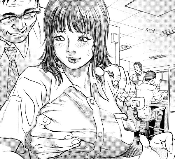 1girl3boysbreastscleavageditheringgrabbing another's breastgreyscalegropinghalftonelarge breastsmonochromemultiple boysofficeoffice ladypublic indecencyscreentones