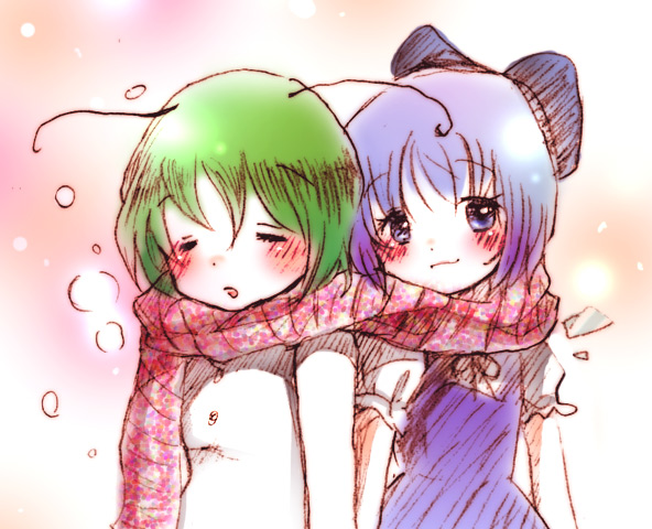 2girlsantennaeblue eyesblue hairblushbowchildclosed eyesdressfemale focusgreen hairhair bowicemultiple girlsscarfshared clothesshared scarfsnow