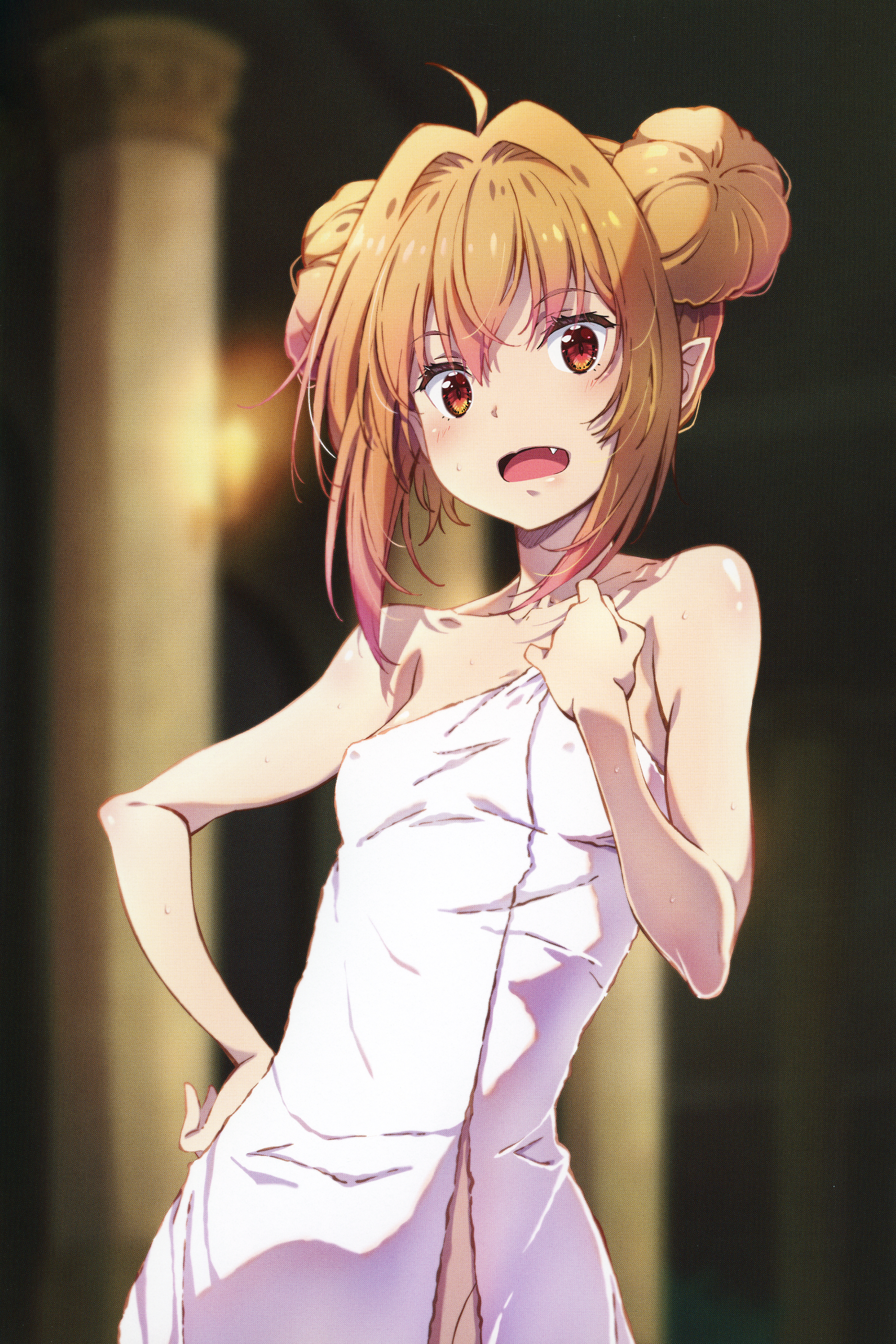 1girlahogeblonde hairblushbreastscollarbonefanghair bunindoorslooking at viewernaked towelopen mouthpointy earsred eyessmall breastssolotowel