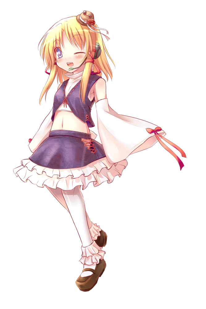 1girlblonde hairblue eyescosplaydetached sleevesfemale focusfull bodyhatidoljapanese clothesmary janesmidriffmikonavelone eye closedpantyhosepurple eyesshoessimple backgroundskirtsolowhite backgroundwink