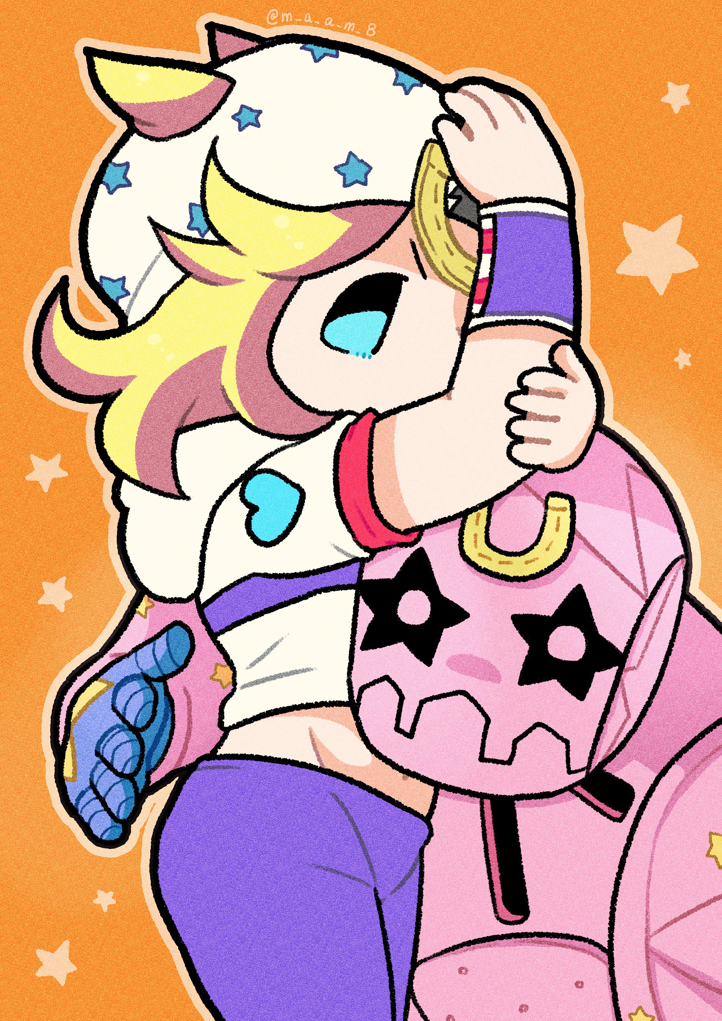 1boy1otherblonde hairblue eyeschibichibi onlycolored skinhatheart ornamenthoodhood downhoodiehorseshoe hat ornamenthorseshoe ornamenthugjojo posemale focusmedium hairmidrifforange backgroundpantspink skinpurple pantsred sleevesshort sleevesstand (jojo)star (symbol)star printtwo-tone sleeveswhite hatwhite hoodiewhite sleeveswristband