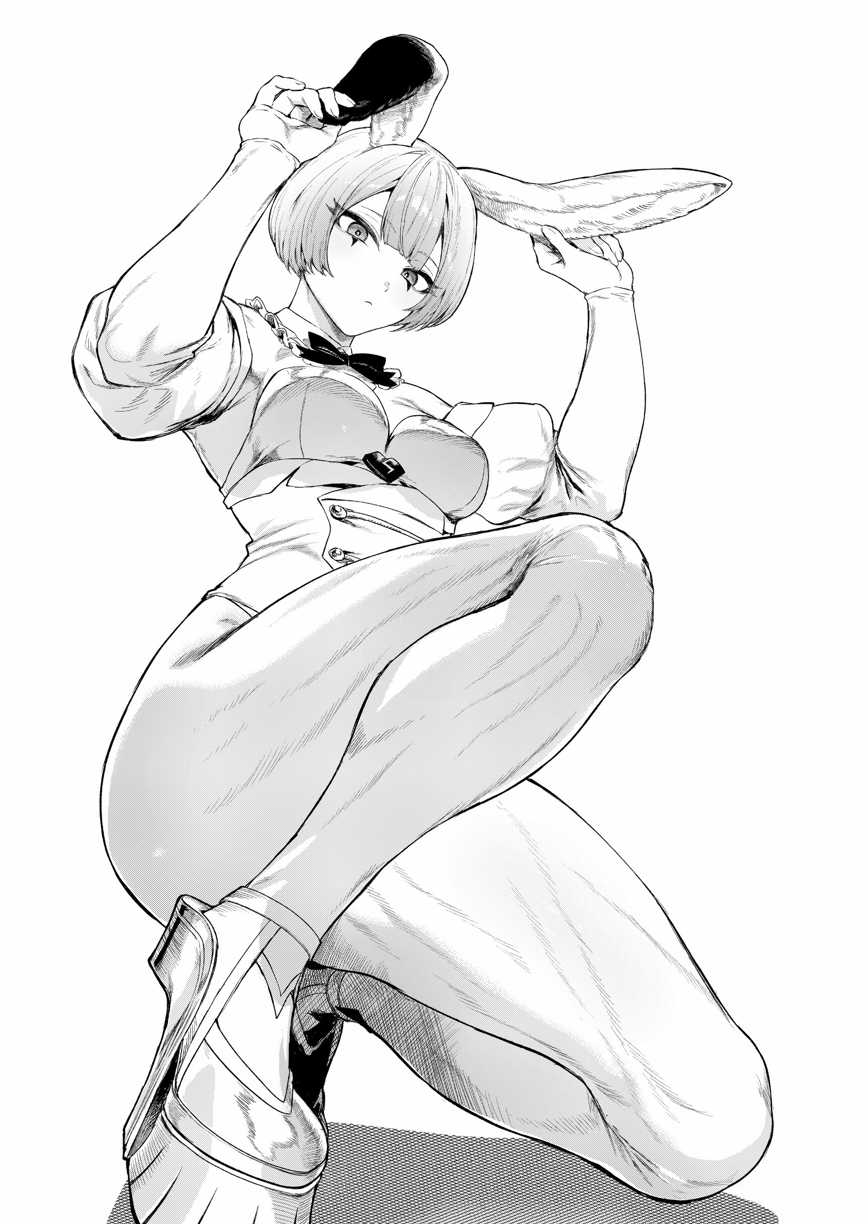 1girlanimal earsbowbowtiebreastsfake animal earsfrom belowfull bodygreyscalekagurai ~kagura and raito~kneelinglooking at viewermonochromenontraditional playboy bunnypantyhosepuffy short sleevespuffy sleevesrabbit earsshort hairshort sleevessolothighs