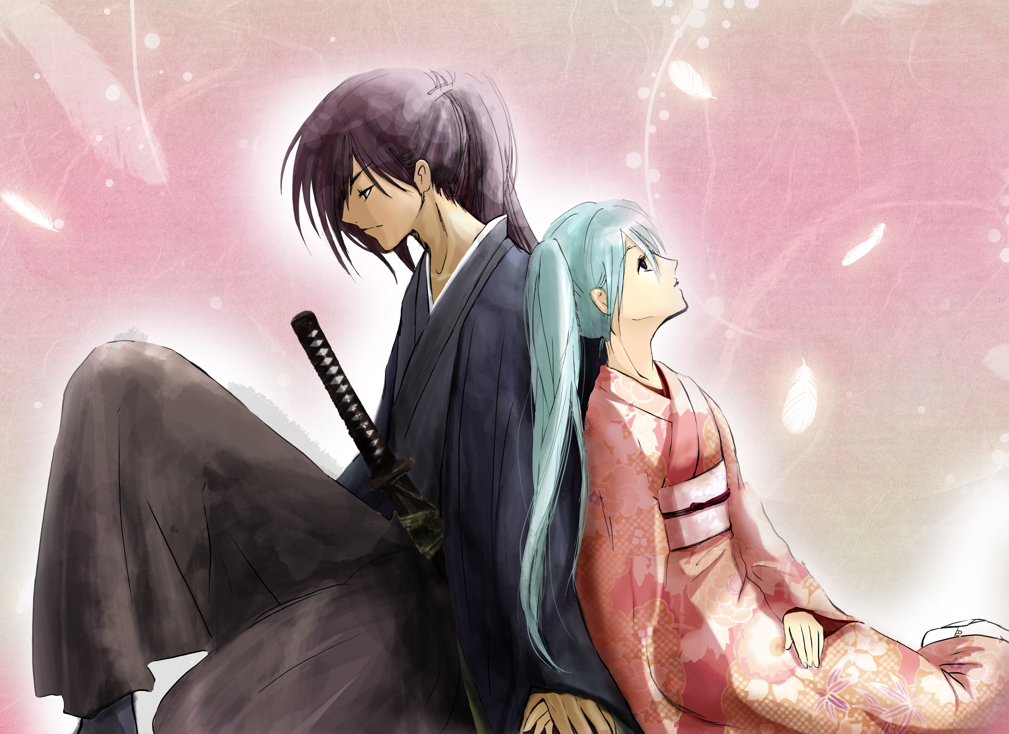 arms at sidesfeathershakamahakama skirthand on own thighhigh ponytailjapanese clotheskatanaleaning on personponytailred backgroundsittingskirtsocksswordweapon