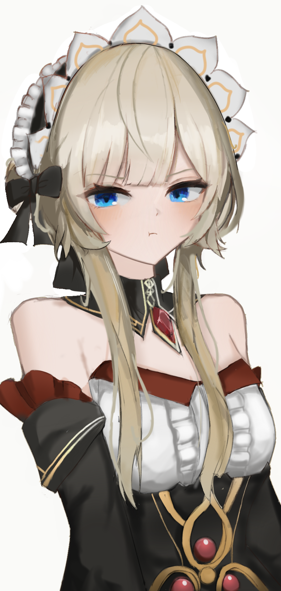 1girlbare shouldersblack bowblack dressblue eyesblushbowbroochcenter frillsdetached collardetached sleevesdressdududu (duuududu)frillsgrey backgroundgrey hairhair bowhairbandjewelrylong hairlong sleeveslooking at viewersidelockssimple backgroundsolostraplessstrapless dresstwo-tone dressupper bodywhite dress