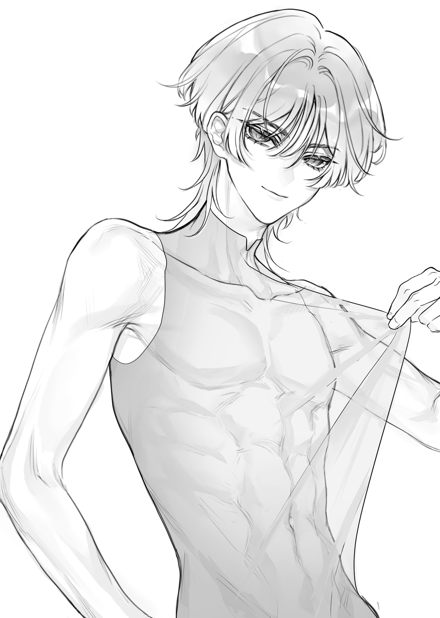 1boyarm at sidebare shouldersbishounenblunt endsbodysuitbodysuit pullchoppy bangsclosed mouthcovered abscovered collarbonecovered naveleyelashesfingernailsgreyscalehacwsshair intakeshand upmale focusmandarin collarmonochromepectoralssee-through bodysuitsee-through clothessmilesolotsurimeupper bodywhite background