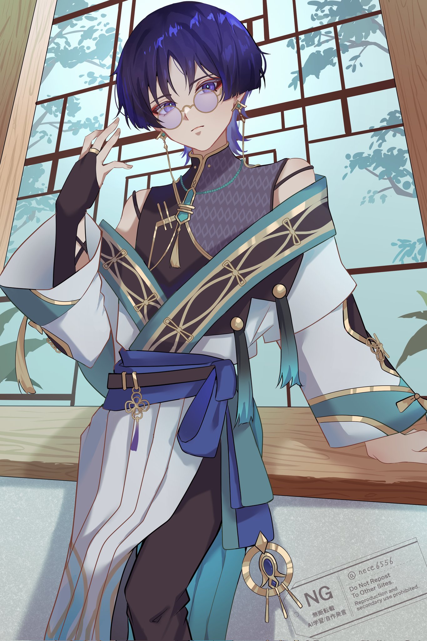 1boyalternate costumeaqua trimarm at sidearm cutoutarm supportbead necklacebeadsbeltbespectacledblack beltblack bridal gauntletsblack pantsblack shirtblunt endsbridal gauntletsbright pupilschinese clothesclosed mouthclothing cutoutcowboy shotcurled fingersearringsexpressionlesseyelinereyeshadowfingernailsglassesgoldgold ringgold trimgrey shirthand uphoyofairjewelrylong sleevesmakeupmale focusmandarin collarmiddle ringnecklaceoff shoulderpantspink lipspurple eyespurple hairpurple sashpurple-tinted eyewearred eyelinerred eyeshadowroberound eyewearsashshirtside slitsolotassel necklacetinted eyeweartsurimetwo-tone shirtwatermarkwhite pupilswhite robewhite sleeveswispy bangsyellow-framed eyewear