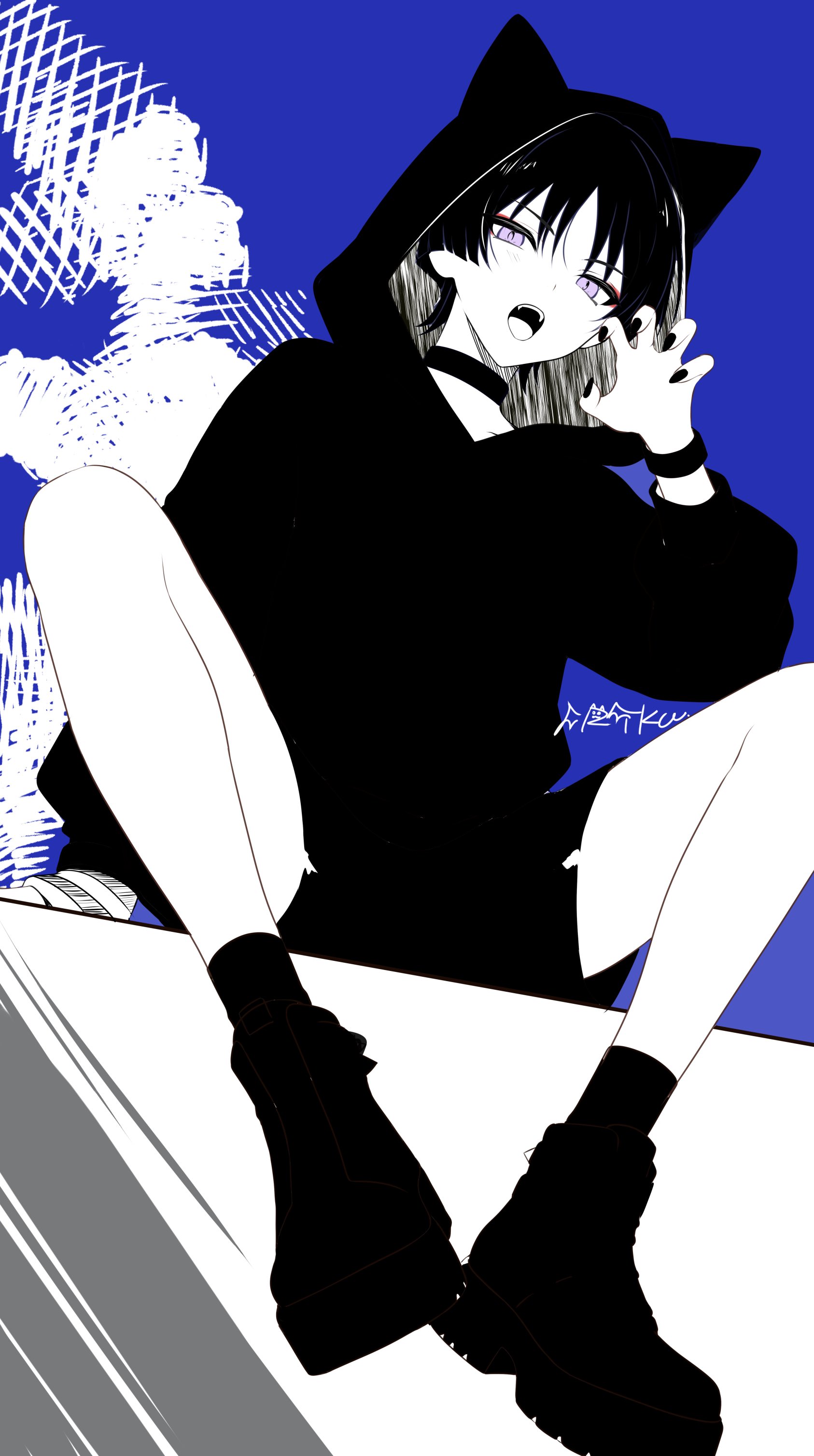 1boyalternate costumeanimal ear hoodarm at sideblue backgroundblunt endscasualchokerclaw posecontemporarycurled fingerseyelinereyeshadowfake animal earsfingernailsgreyscale with colored backgroundhand uphoodhood uphoodielong sleeveslooking at viewermakeupmale focusopen mouthpurple eyesred eyelinerred eyeshadowshoesshortssittingsockssolospot colorteethtongueupper teeth onlywispy bangswristband