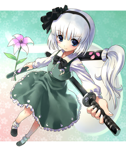 1girlblue eyesbowbowtiefemale focusflowerfull bodyghosthairbandhitodamakatanasheathsheathedshort hairskirtsoloswordweapon