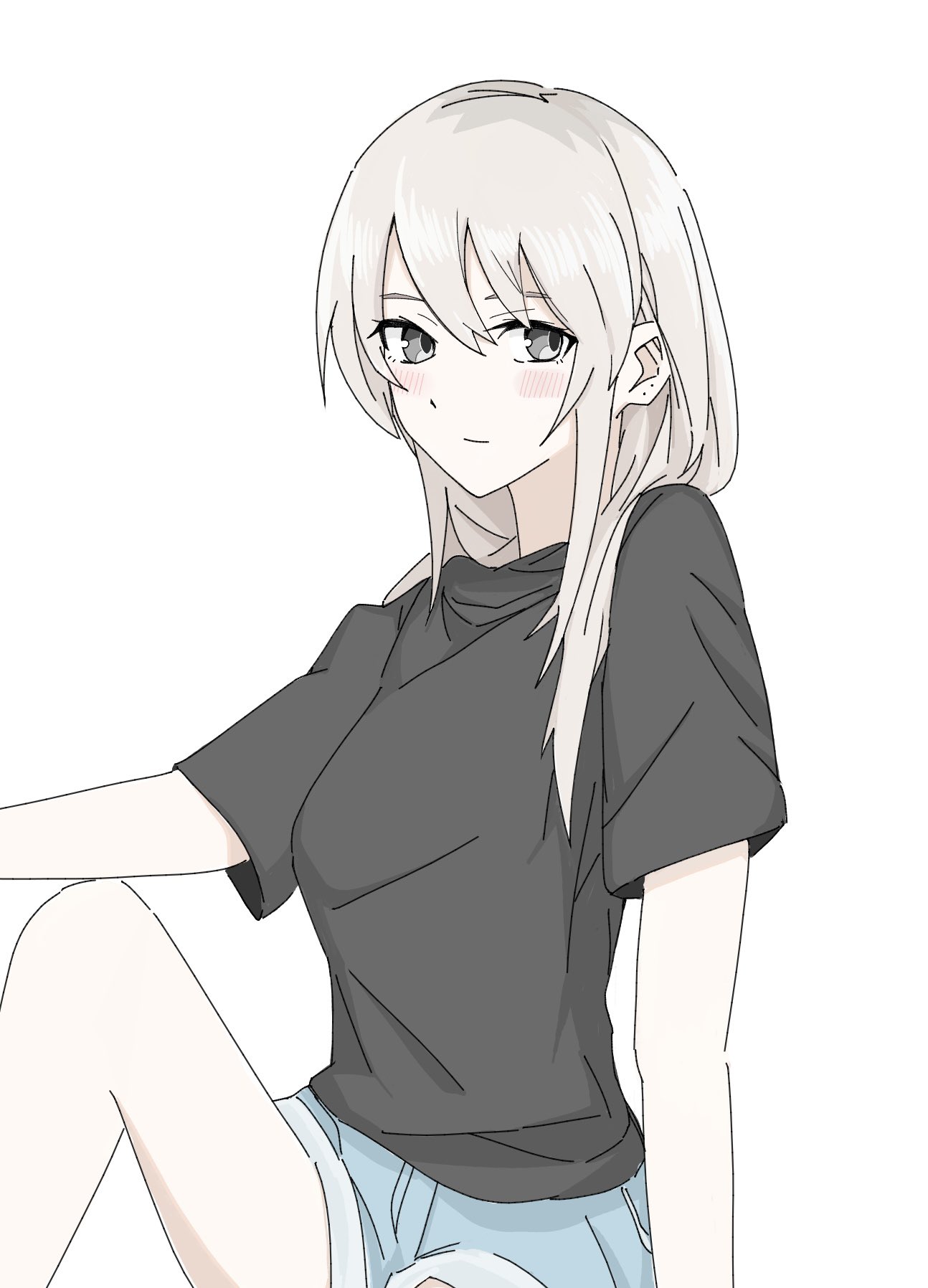 1girlblack shirtblue shortsblushclosed mouthgrey eyesgrey hairhair between eyeslong hairmulticolored hairpiercing holeroots (hair)shirtshort sleevesshortssidelockssimple backgroundsolowhite background