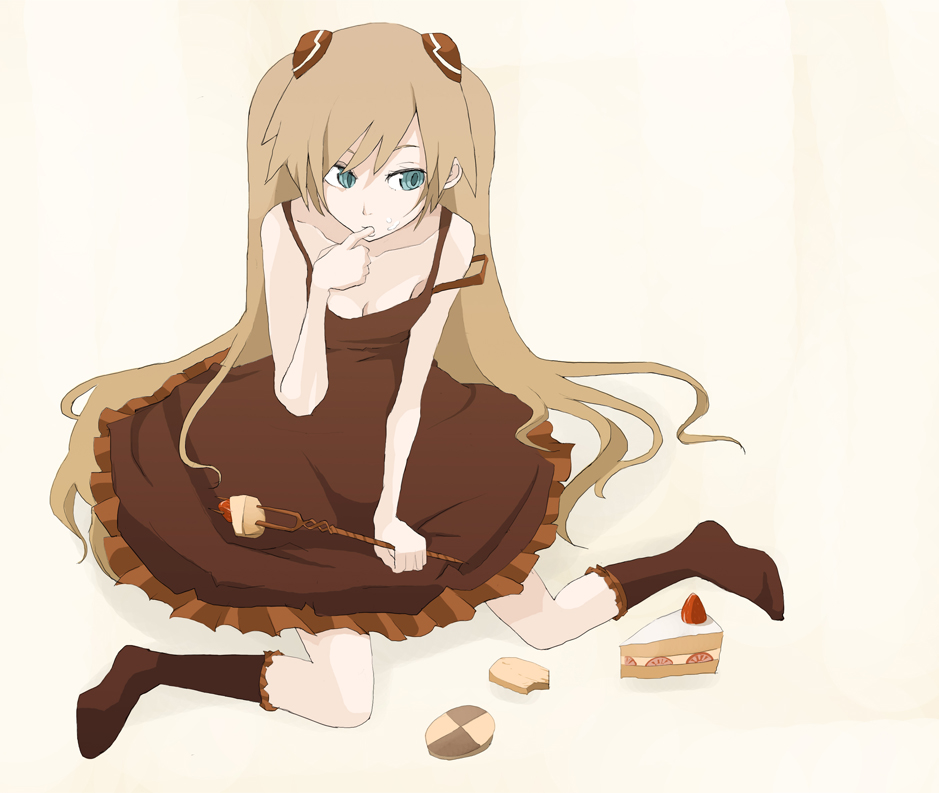 blue eyesbrown haircakecheckerboard cookiecookiedresseatingfoodfruitkneelinglance of longinus (evangelion)long hairpastrysittingsockssolostrap slipstrawberryweapon