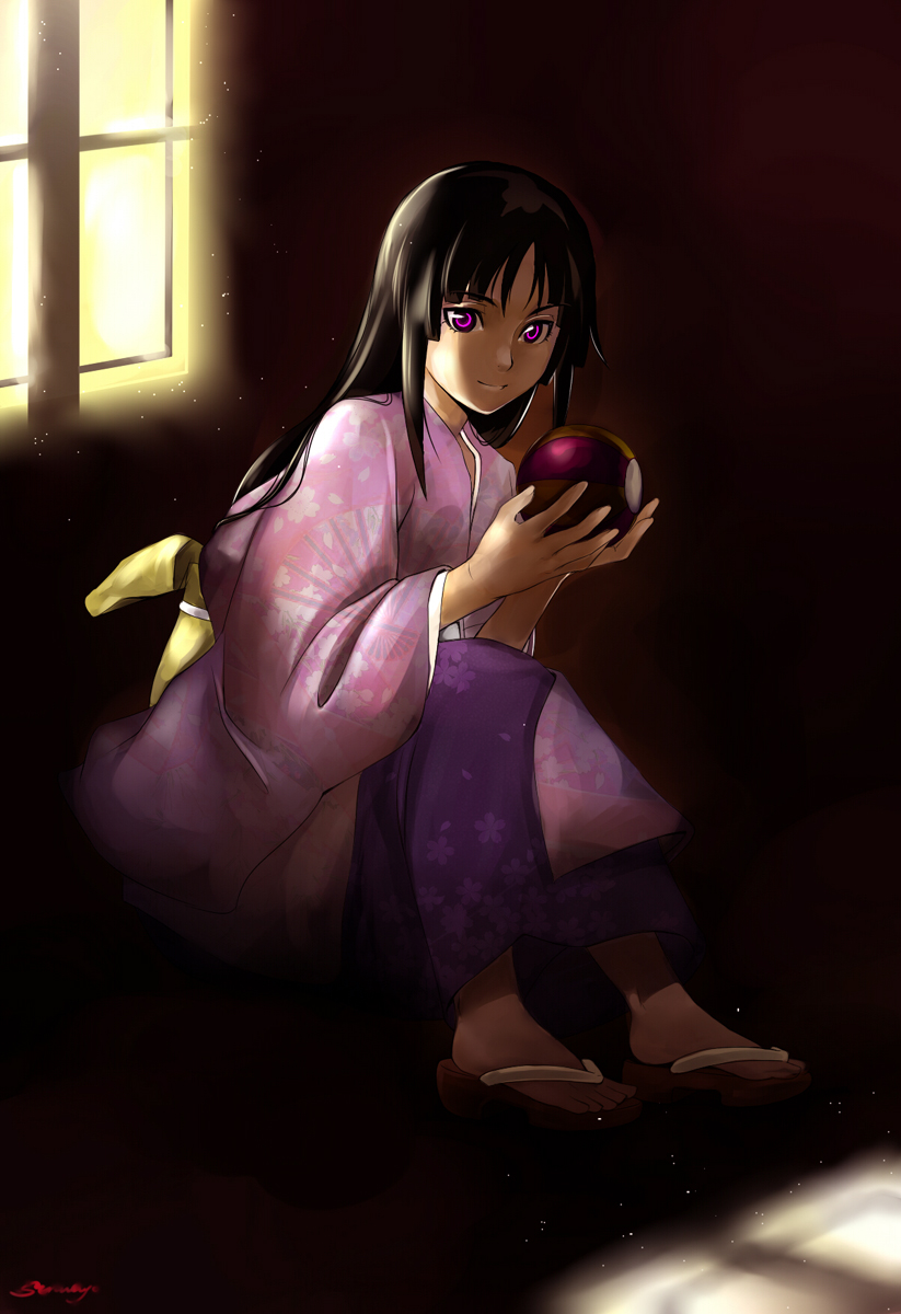 00sappleblack hairfeetfoodfruitjapanese clotheskimonolong hairpurple eyessandalssittingsmilesolo
