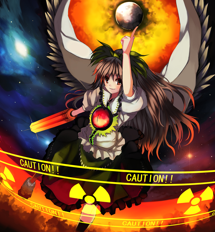 1girlarm cannonblack hairblushbroochcowboy shotfemale focusfiregemgreen skirtjewelrylooking at viewerpointingpointing uppuffy short sleevespuffy sleevesradiation symbolred eyesshort sleevesskirtsoloweaponwings