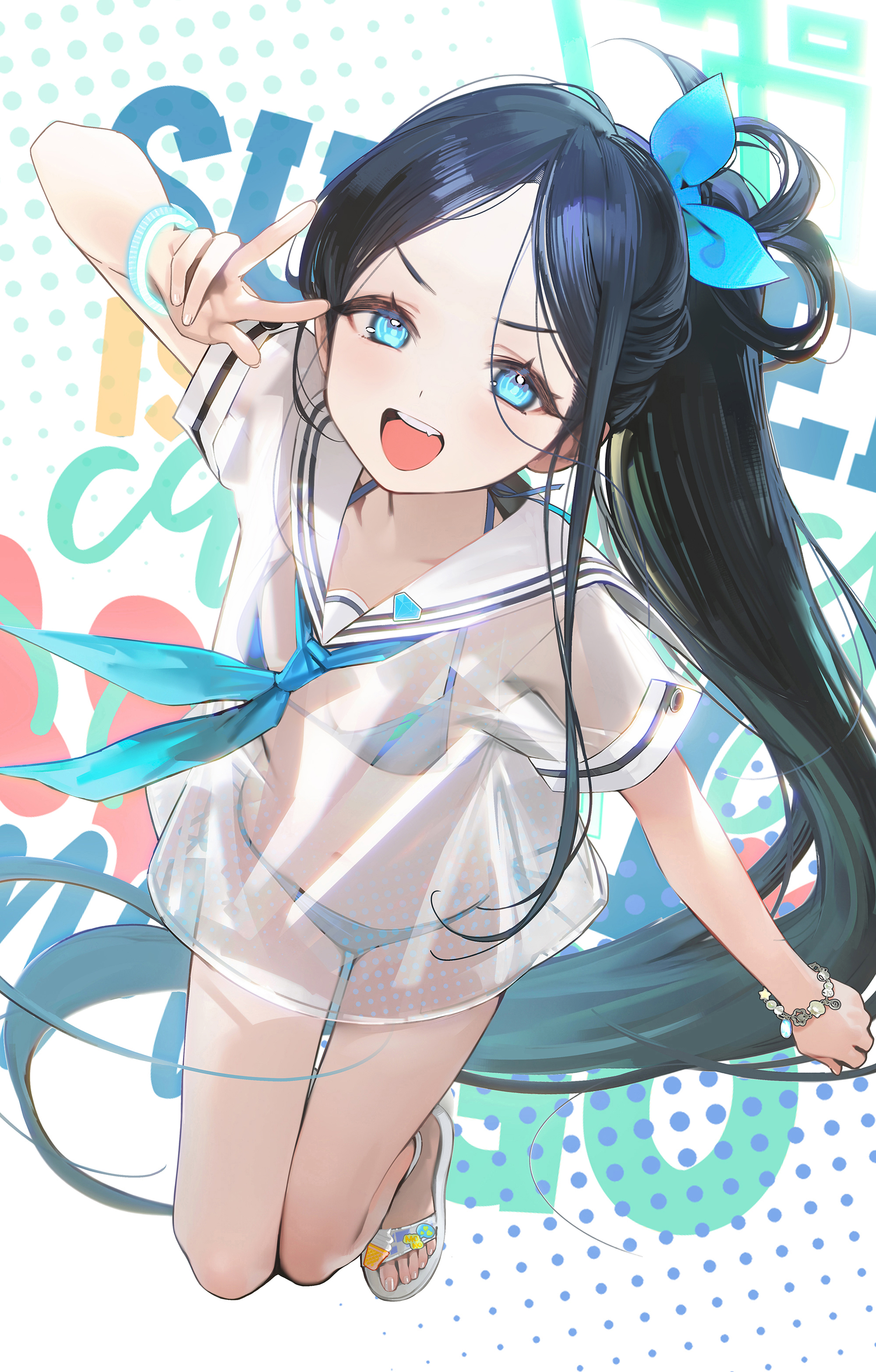 :d1girlalternate costumearm upbikinibikini under clothesbikini visible through clothesblack hairblue bikiniblue bowblue eyesblue neckerchiefblue ribbonblushbowbreastsdressfanghair between eyeshair bowhair ornamentlong hairlooking at viewernavelneckerchiefopen mouthparted bangspolka dotponytailribbonsailor collarsailor dressschool uniformsee-through clothessee-through dressshort sleevessmilesolostandingstring bikiniswimsuitvvery long hair