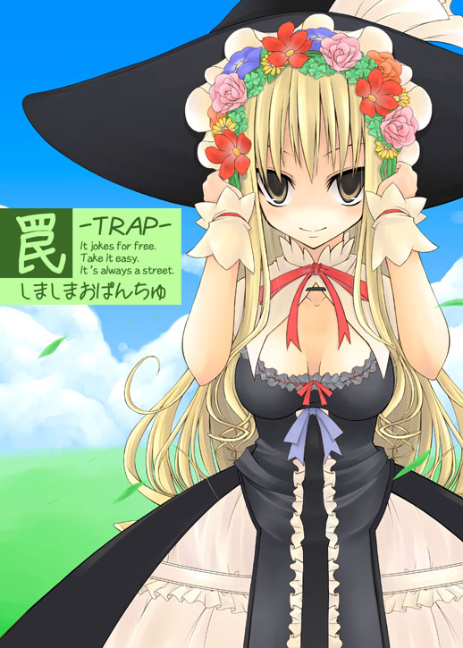 1girlblonde hairbowbowtiebreastscleavagedressfemale focusflowerhathat ribbonnatureoutdoorsplantribbonskysolowitchwitch hatyellow eyes