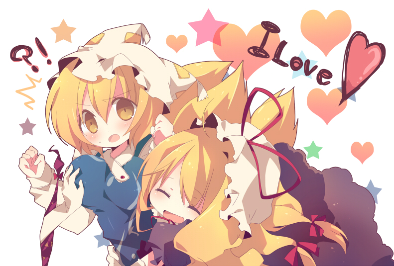 :d1boy2girlsanimal hatblonde hairbreastsclosed eyeselbow glovesenglish textfemale focusgap (touhou)glovesgrabbing another's breastgropinghathearthuglong sleevesmob capmultiple girlsopen mouthpuffy short sleevespuffy sleevesshort hairshort sleevessmilestar (symbol)surprisedtasselyellow eyesyuri