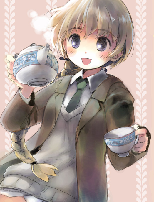 00s1girlblue eyesblushbraidbrown haircupfemale focusnecktiepantiessingle braidsmilesoloteateacupteapotunderwear