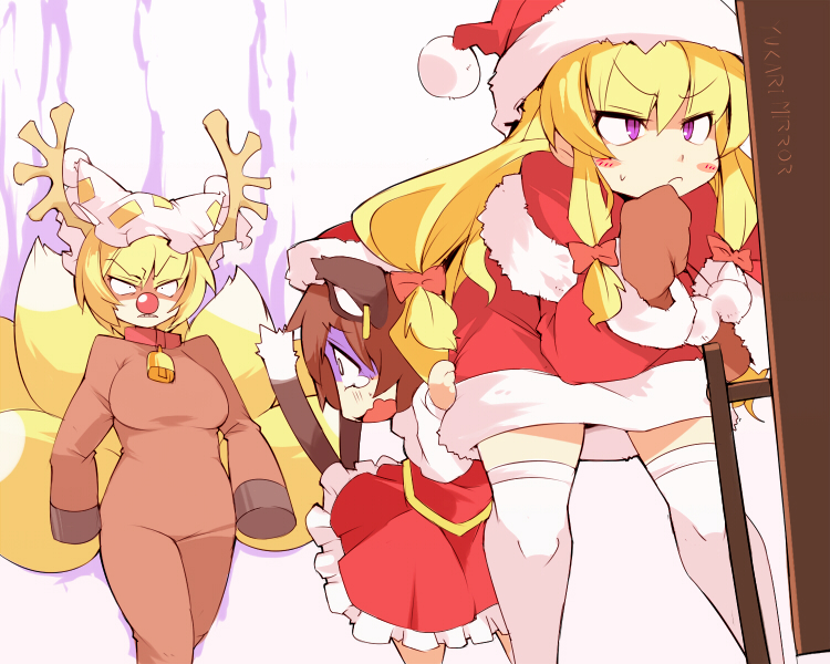 3girlsangryanimal costumeanimal earsanimal hataurabellbent overblonde hairbrown haircat earscat girlcat tailchristmascollarfemale focusfox earsfox tailhatlong hairlong sleevesmirrormob capmultiple girlsmultiple tailsneck bellnekomatapurple eyesreindeer costumeribbonsanta costumescaredshort hairtailtasseltearsthighhighsturn palezettai ryouiki