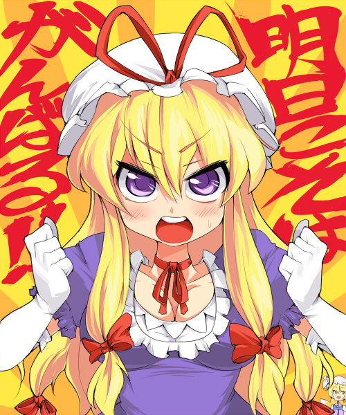 2girlsangryanimal hatblonde hairblushelbow glovesfemale focusgloveshatlong hairlong sleevesmob capmultiple girlspuffy short sleevespuffy sleevespurple eyesribbonshort hairshort sleevessolo focustasselwhite gloves