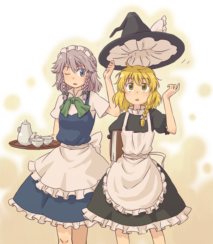 2girlsblonde hairblue eyesbookbraidfemale focushairbandhatholdingholding unworn hatlong hairmaidmessy hairmultiple girlsone eye closedribbonshort hairtraytwin braidsunworn hatunworn headwearwinkwitchwitch hatyellow eyes