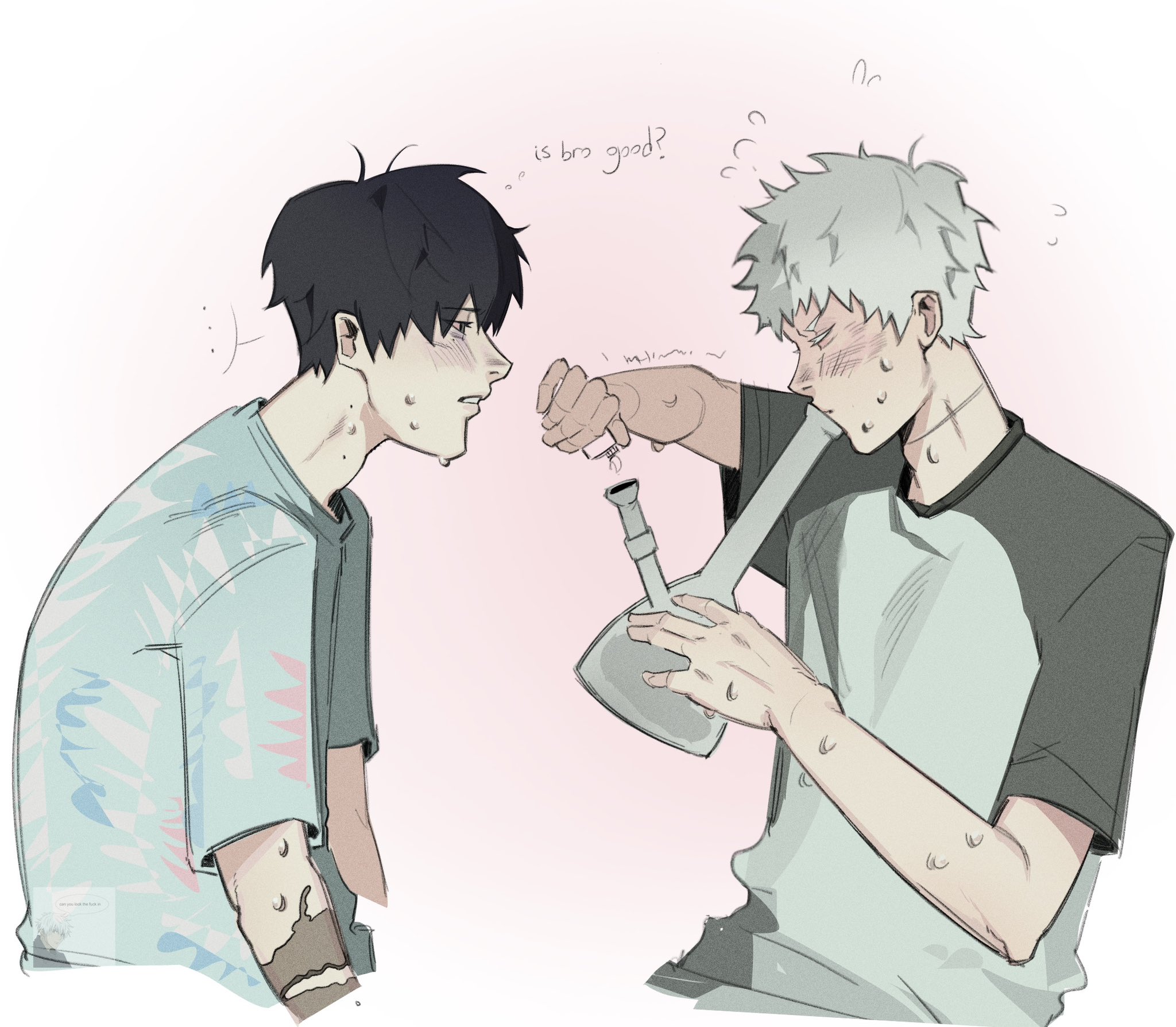 1boy2boysblack hairblushbongclosed eyescropped torsodrugsenglish textfrom sidehikarusphlatassholdingholding bongholding lighterlightermale focusmolemole on neckmole under eyemultiple boysmultiple molesscarscar on armshirtshort hairsweatwhite hair