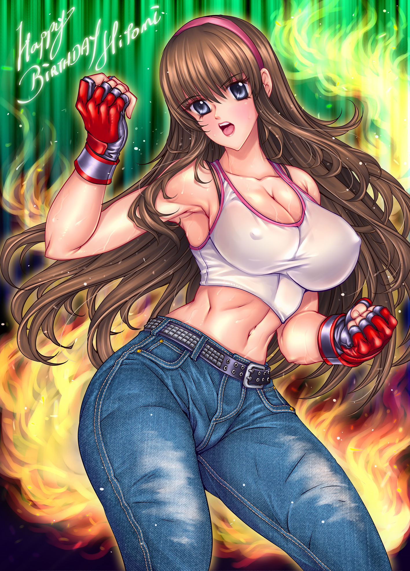 beltblue eyesblushbra strapbreastsbrown haircleavagecovered erect nipplesdenimfingerless glovesgloveshairbandhands uphappy birthdayjeanslarge breastslong hairmidriffmomiji arbournavelopen mouthpantspink hairbandred glovessidelockstank topwhite tank top