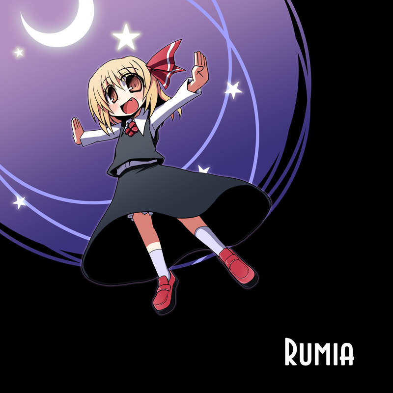 1girlblonde hairbrown eyescharacter namefangfemale focusflyinghair ribbonmoonoutdoorsoutstretched armsred eyesribbonshort hairskysolospread armsstar (symbol)