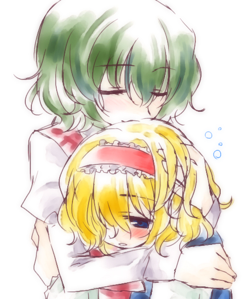 2girlsblonde hairblue eyesblushclosed eyesfemale focusgreen hairhairbandhugmultiple girlsshort hair