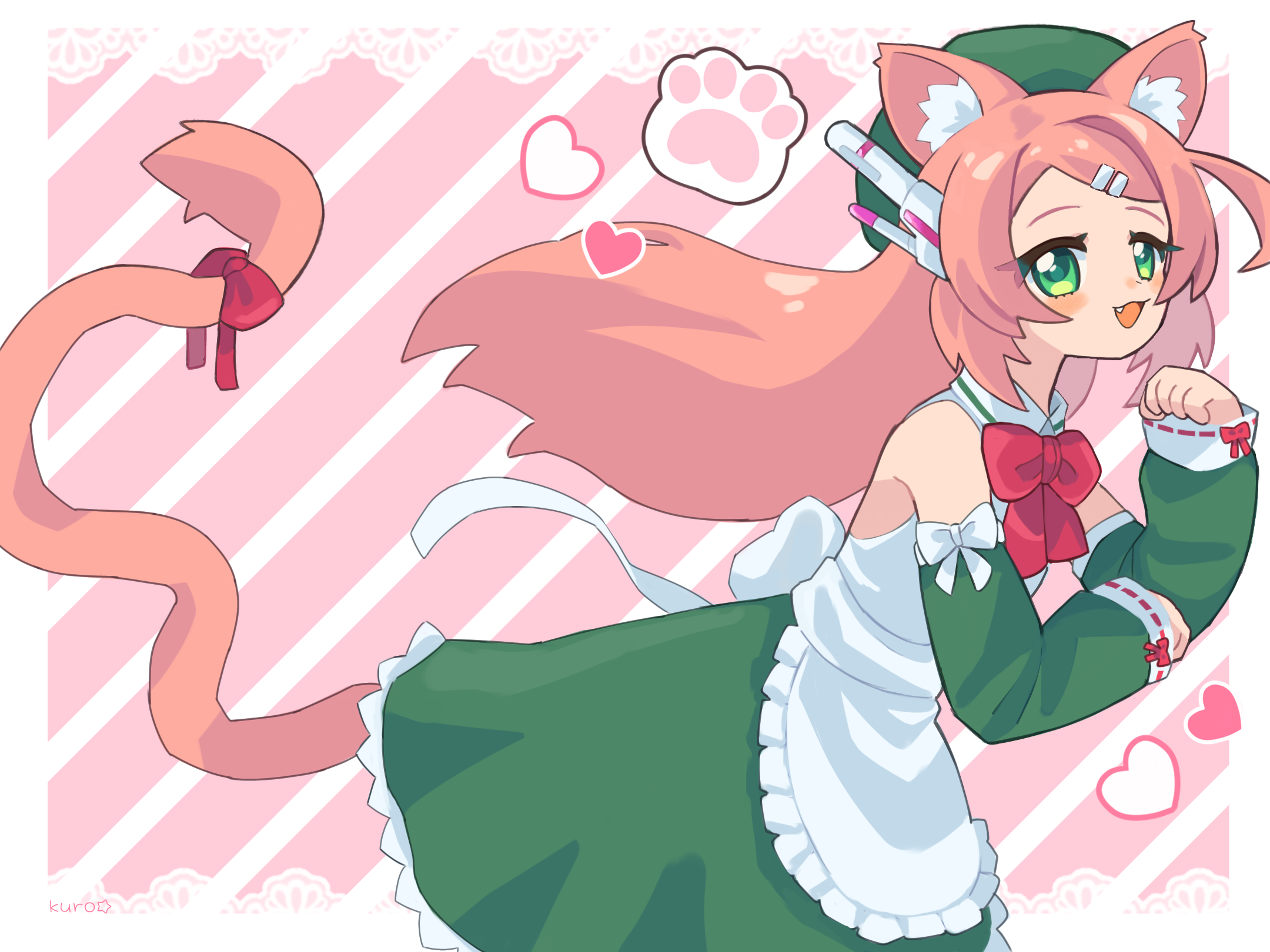 :31girlanimal earsapronberetbowbowtiecat earscat girlcat taildetached sleevesdressfanggreen dressgreen eyesgreen hatgreen sleeveshair ornamenthaircliphatkemonomimi modelacelace trimlace-trimmed dresslong hairlooking at vieweropen mouthpaw posepink hairred bowred bowtierobot earssleeve bowsmilesolotailwhite apron