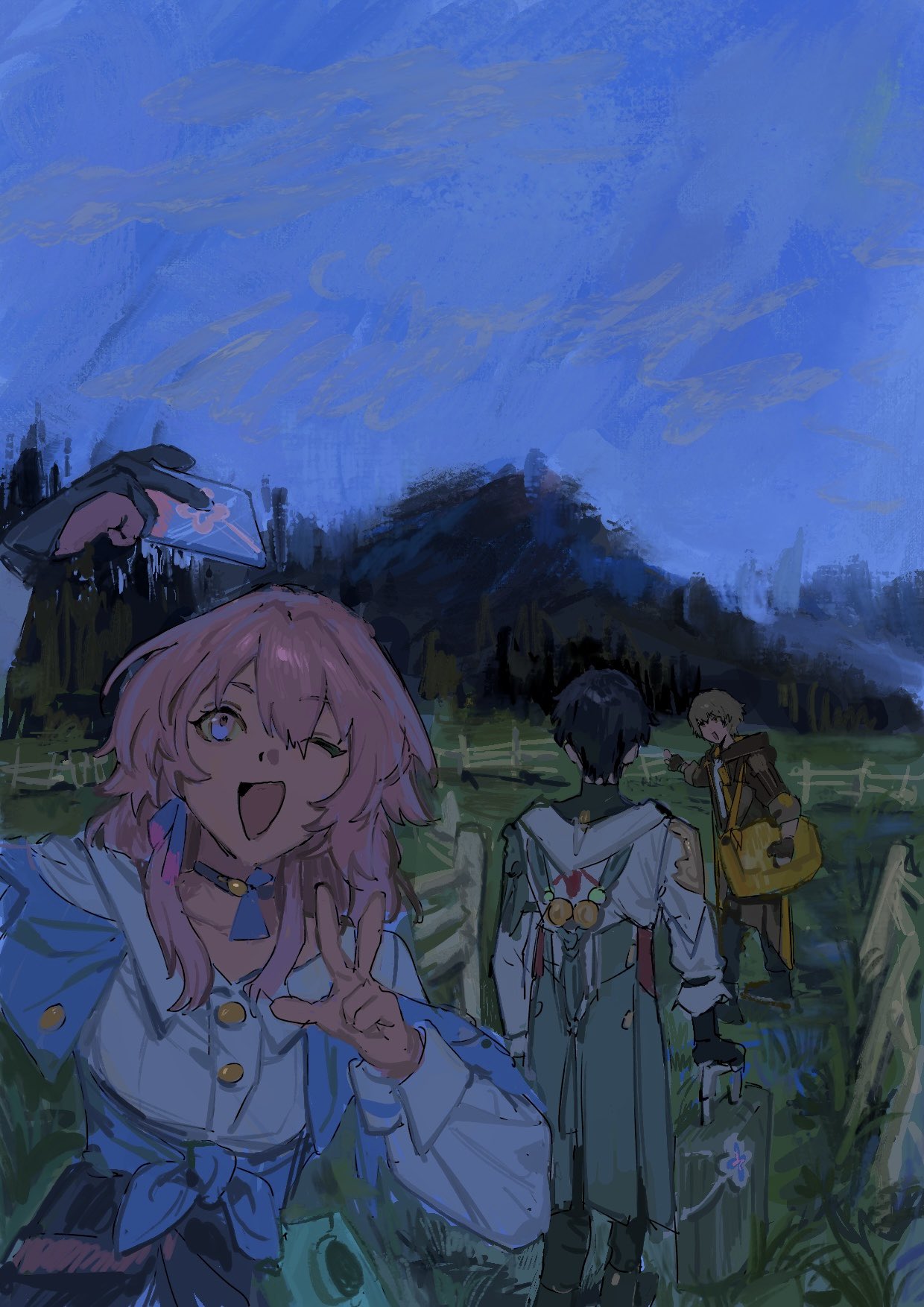 1girl2boysblue skyfencehillholdingholding phonemultiple boysone eye closedopen mouthphoneselfieskysmilewooden fence