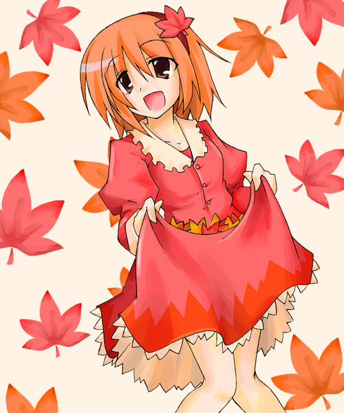 1girlbrown eyesclothes liftfemale focushair ornamentleafleaf hair ornamentopen mouthorange hairshort hairskirtskirt basketskirt holdskirt liftsmilesolo