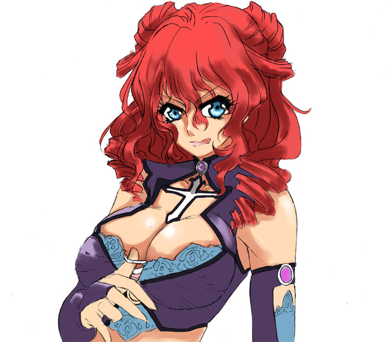 1girlblue eyesbreastsbridal gauntletscleavagedrill hairelbow glovesfemale focusgauntlet style glovesglovesred hairsimple backgroundsolotongue