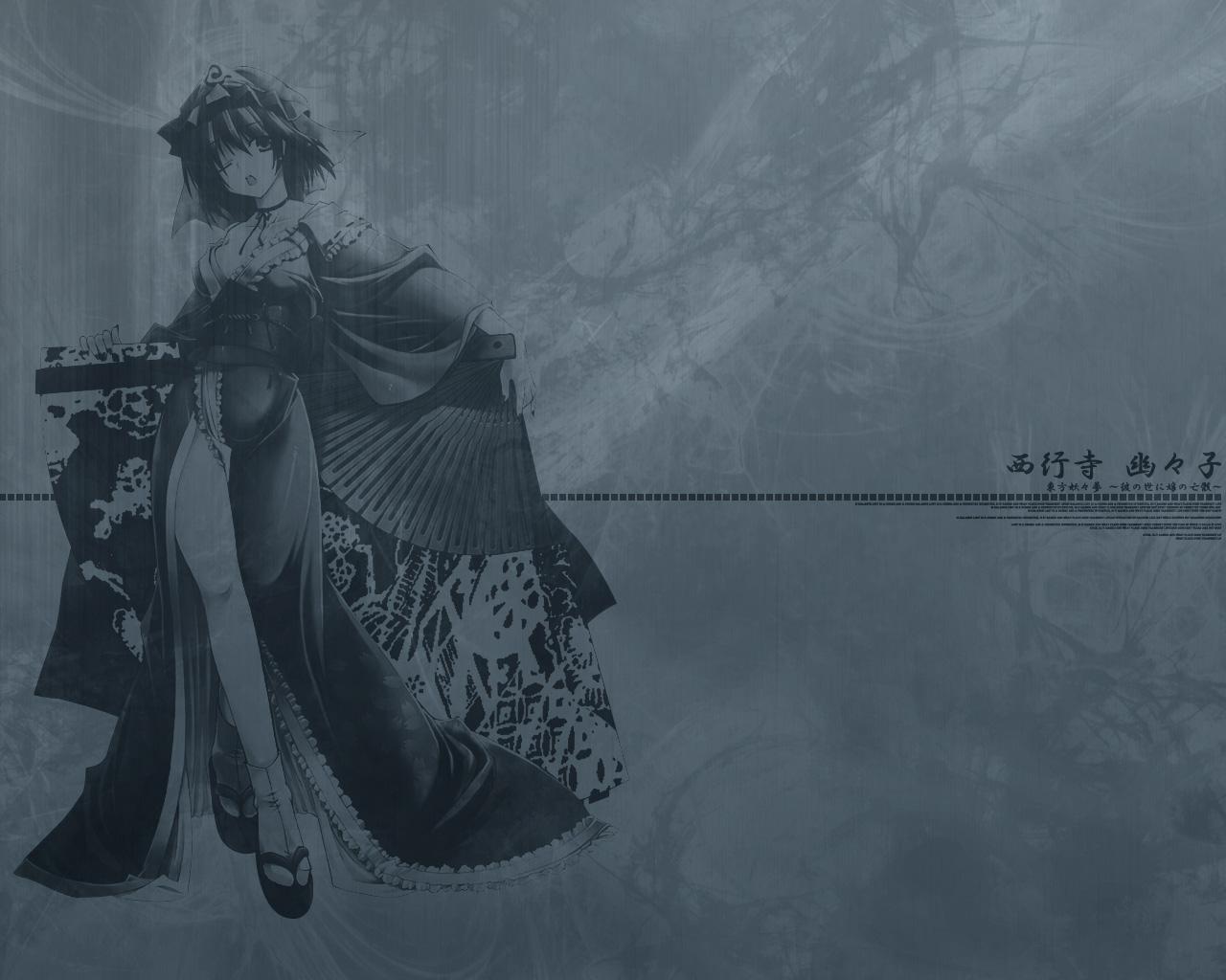 1girlblue themecharacter namefemale focusgoshogurumahand fanhatjapanese clothesmonochromesaigyouji yuyuko's fan designsandalsshippou (pattern)solotabizouri