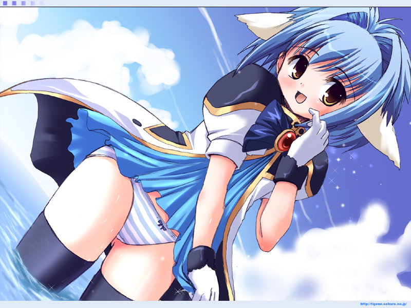 nekomori, liru, renkin san-kyuu magical pokaan, 1girl, animal ears, bandeau bikini, belt bra, blonde hair, blue eyes, dark-skinned female, dark skin, denim, denim shorts, dog ears, fang, female focus, fingerless gloves, gloves, long hair, shorts, solo, tail, thighhighs, wolf ears, wolf tail