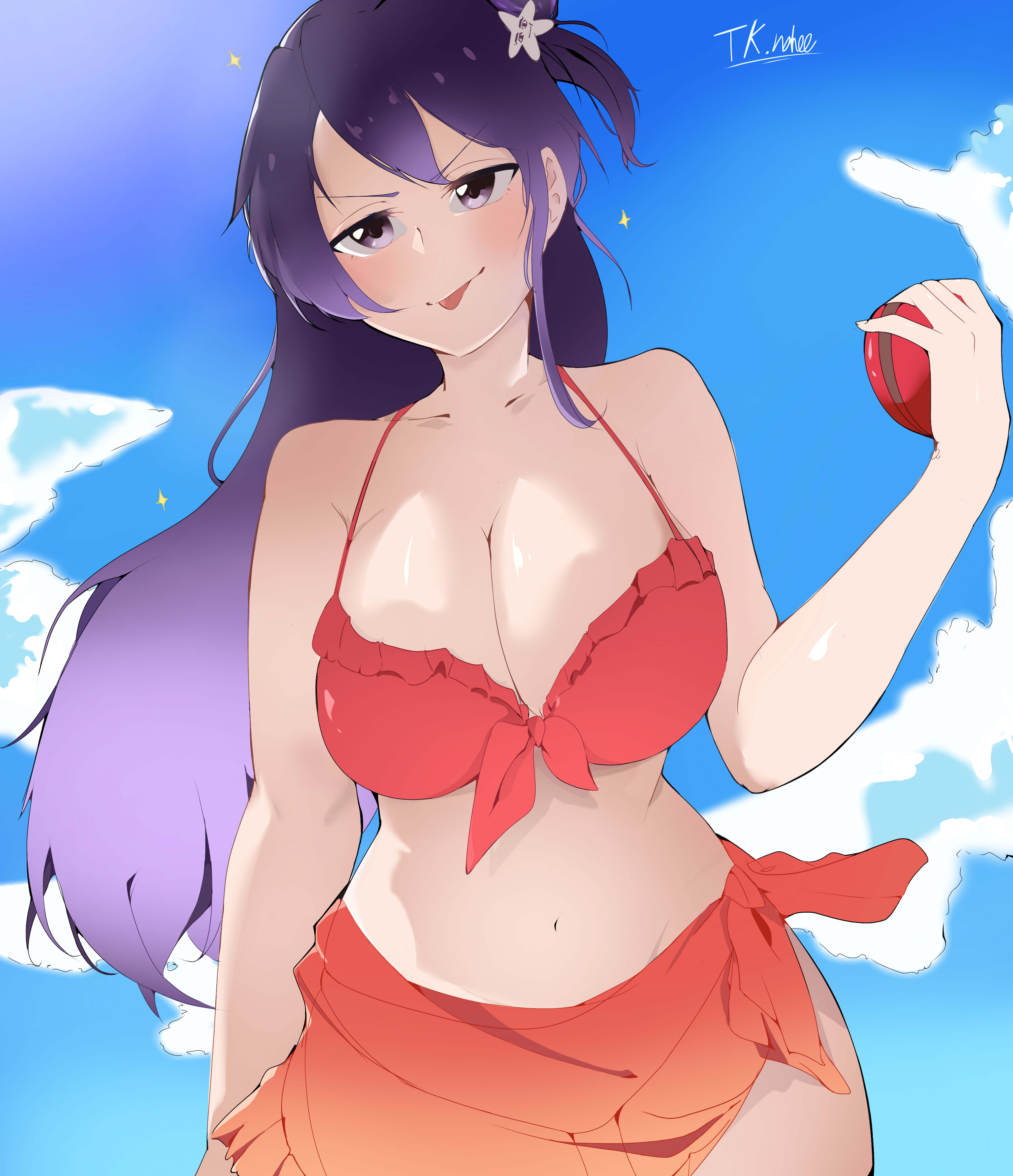 botjira, panty (psg), panty & stocking with garterbelt, highres, 1girl, animal print, blonde hair, blue eyes, breasts, cleavage, colored inner hair, dark-skinned female, dark skin, darkened skin, earrings, fake nails, ganguro, gyaru, jewelry, leopard print, long hair, looking at viewer, multicolored hair, nail polish, navel, panty straps, pink nails, scrunchie, skirt, solo, tan, wrist scrunchie
