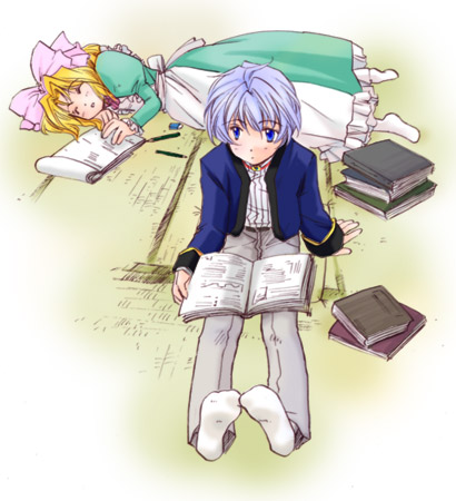 00s2girlsblonde hairblue eyesbookbowhair bowmultiple girlspink bowshort hairsittingsleepingtatami