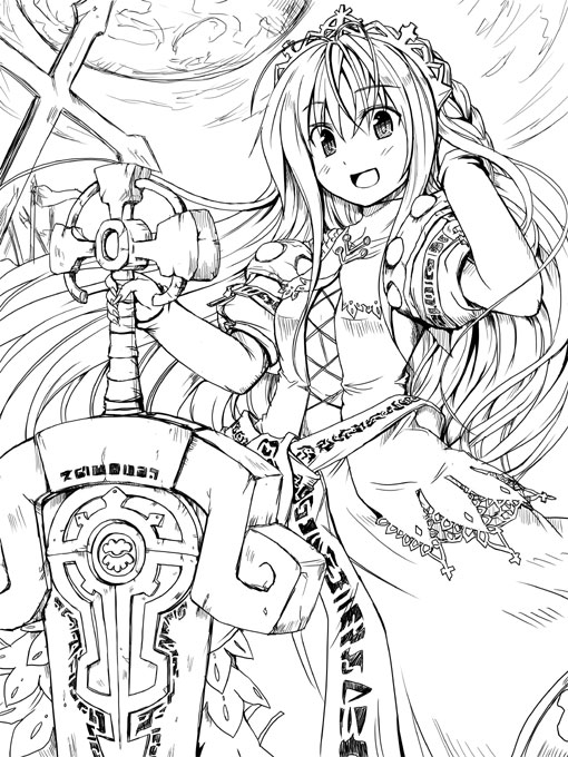 :d1girlarm uparmorarmored dressblushbraidclothes writingcowboy shotcrossdressgreyscalehand in own hairholdingholding swordholding weaponlineartlong hairlooking at viewermonochromemoonopen mouthpuffy short sleevespuffy sleevessheathsheathedshort sleevesside braidsmilestandingstraight hairswordtiaravery long hairweapon
