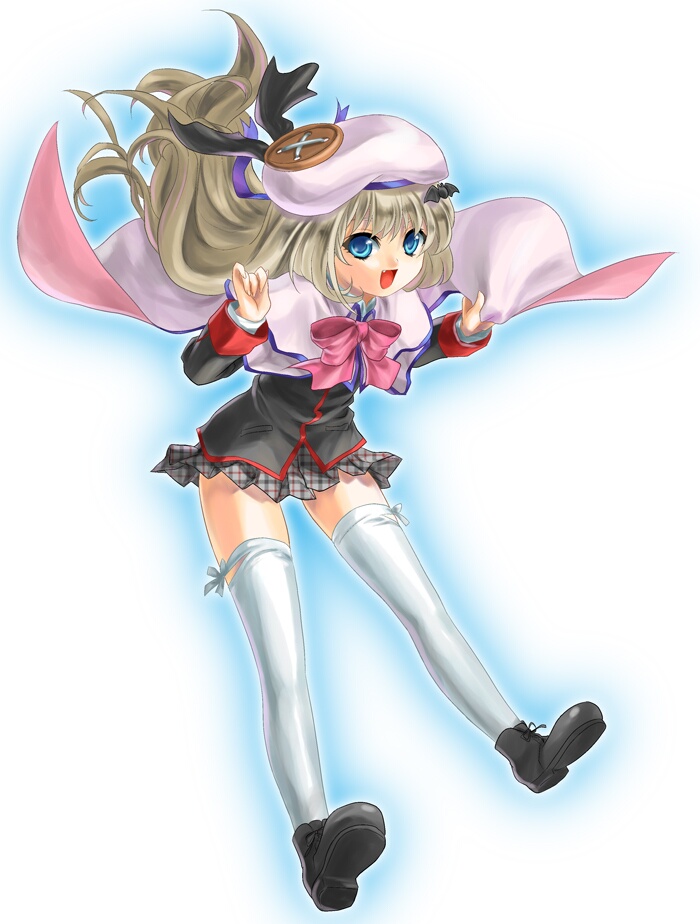 :d1girlbat hair ornamentberetblonde hairblue eyesbootsbowbuttonscapefangfemale focushair ornamenthaircliphatlarge buttonslegslong hairlooking at vieweropen mouthpink bowplaid clothesplaid skirtskirtsmilesolothighhighswhite thighhighs