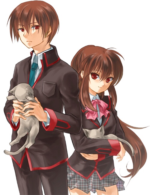 1boy1girlanimalbowbrown haircatlong hairnecktiepink bowplaid clothesplaid skirtponytailred eyesschool uniformshort hairskirt