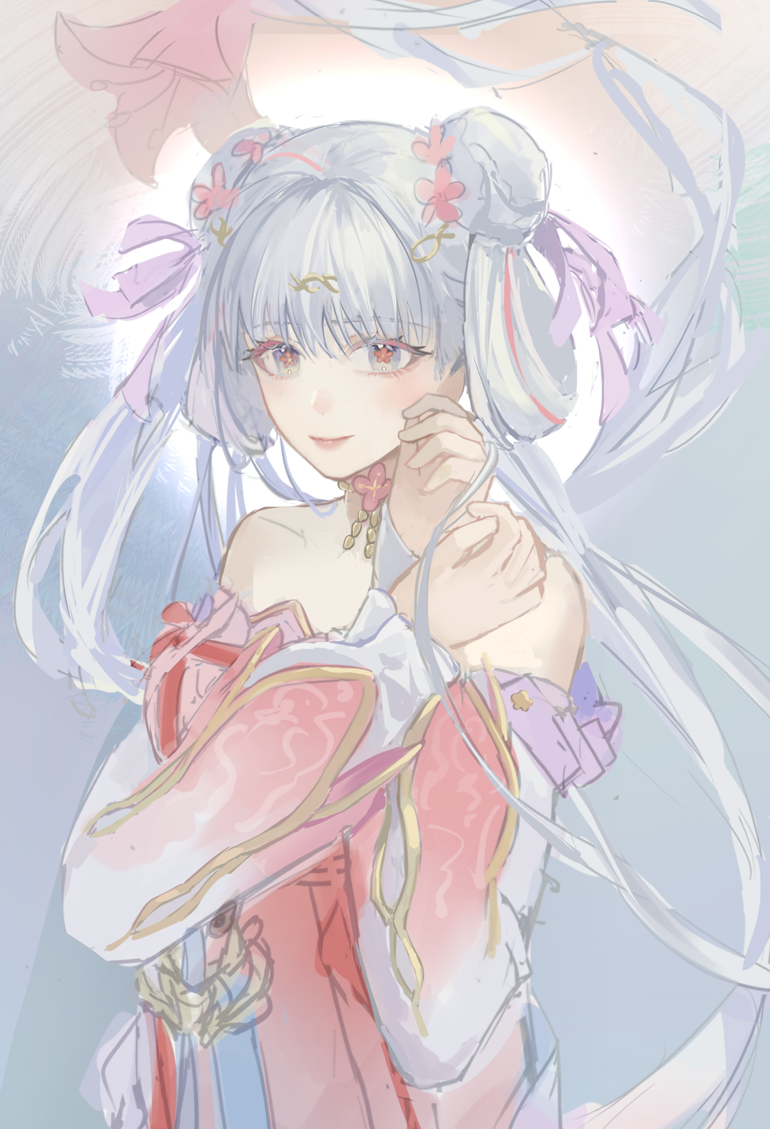 1girlbare shoulderschinese clothesclosed mouthdressflowerhair flowerhair ornamenthair ribbonhair ringshanfulong hairlooking at viewerofficial alternate costumepink dresspink flowerpink pupilspurple ribbonqixiong ruqunribbonsmilesoloupper bodywhite eyeswhite hair