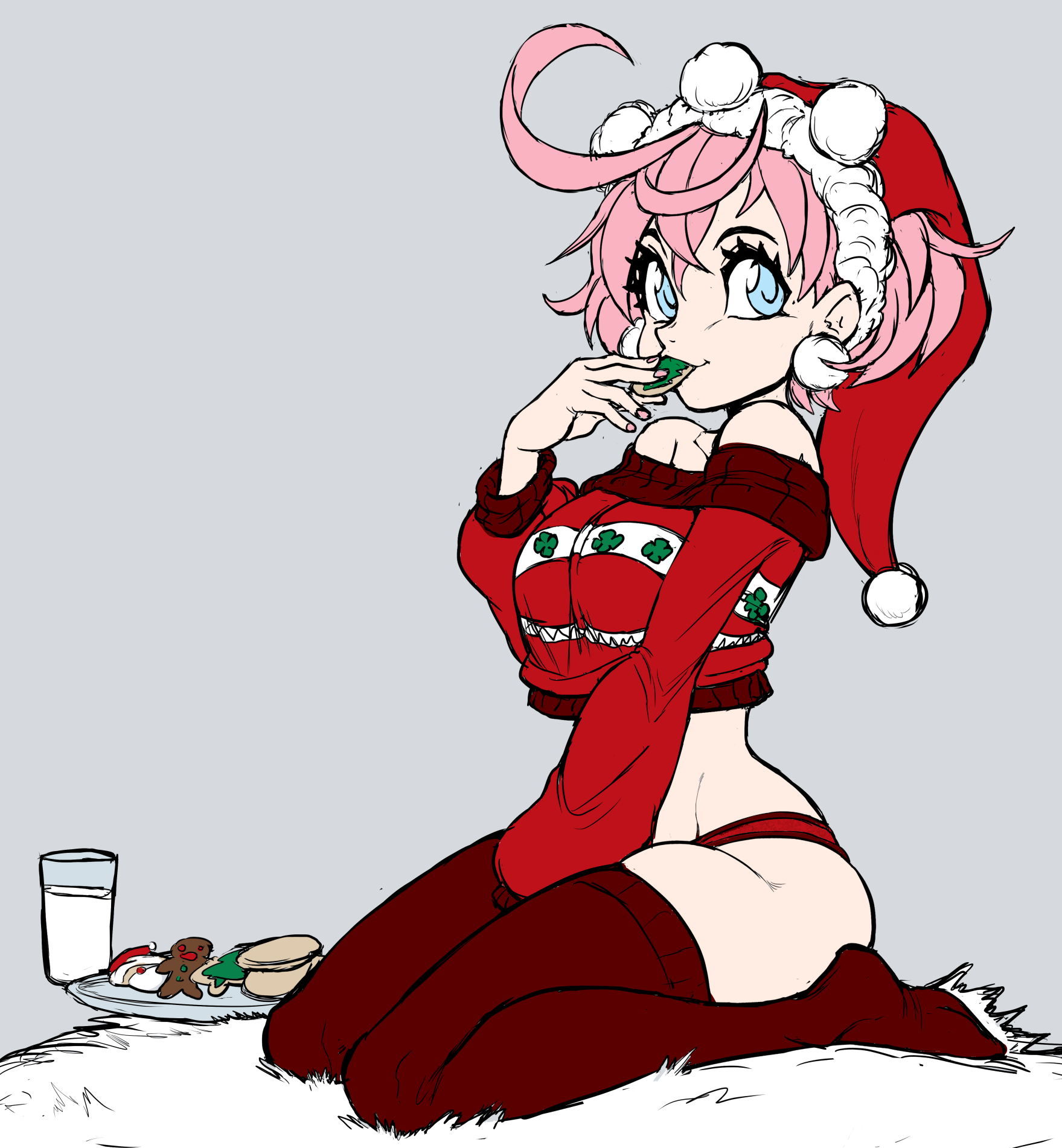 bare shouldersblue eyeschristmas sweatercleft of venuscookieeatingfoodfur rugglass of milkhatkneelingpantiespink hairred pantiessanta hatthighhighsunderwear