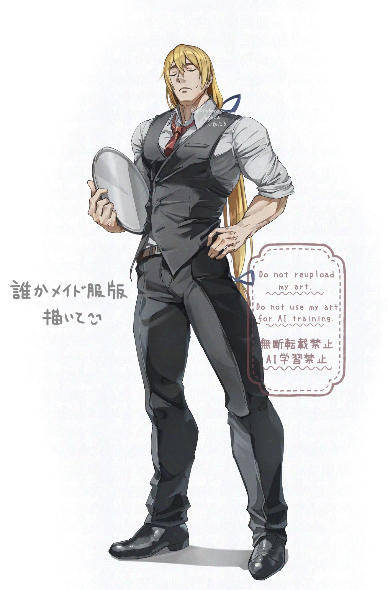 1boyalternate costumebeltblack pantsblack vestblonde hairblue ribbonbrown beltclosed eyesclosed mouthdress shirtfull bodygrey shirthair ribbonhand on own hipholdingholding traylong hairmale focusmuscularmuscular malenecktiepantsred necktieribbonshirtsimple backgroundsleeves rolled upsolostandingsweatdroptrayvestwaiterwhite background